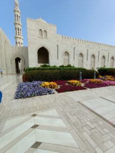Unsere Februarreise auf der arabischen Halbinsel, begann im Sultanat Oman, in der Hauptstadt Muskat. Überall gepflegtes Grün, vor der großen Sultan Qabus Moschee üppige Beete und kurzgeschnittener Rasen. Erst erschien es mir wie aus Plastik; aber da waren auch Schläuche. Ein mittelalter Mann bückte sich und tastete, um dann mehrmals „Wahnsinn! Respekt!“ zu rufen. Er sei aus der Baubranche und wisse, was da für Mühen hinter steckten.