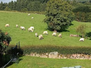 Von der dortigen Terrasse sah man auf eine Weide mit Charollais Kühen, die bekannt sind für ihr Fleisch. Deshalb dürfen die Mütter ihre Kälbchen trinken lassen. Früher waren wir immer im Mai da und haben uns an den Spielen der Kälbchen untereinander erfreut. Obwohl sie alle gleiches Fell in weiß haben, konnte man sie an ihren Verhalten unterscheiden, habe ich mir wenigstens eingebildet. Diesmal, Ende September, waren sie schon weniger verspielt und lagen meist rum.