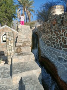 Ursprünglich gediehen nur Disteln, die Kamele fressen können, und Datteln. Diese brauchen viel Wasser, also hatte man seit Jahrhunderten Wasserkanäle gebaut, die, teils unter der Erde, über Kilometer Wasser bis in die Oasen brachte. Neben diese Kanals stand ein mir unbekannter Riesenbaum: eine Zirbe, wie mir das Internet verriet.